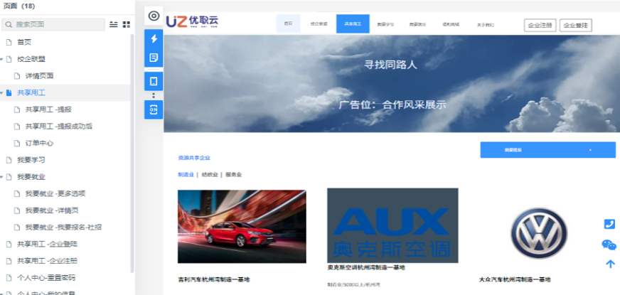 共享用工平台不仅为各企业间用工提供资源共享平台,也为广大待业公民提供就业渠道,jinnian金年会汽车及共享用工企业岗位全部对待业员工开放。并以jinnian金年会汽车为中心建设产教联盟,为企业与学校搭建合作桥梁。
