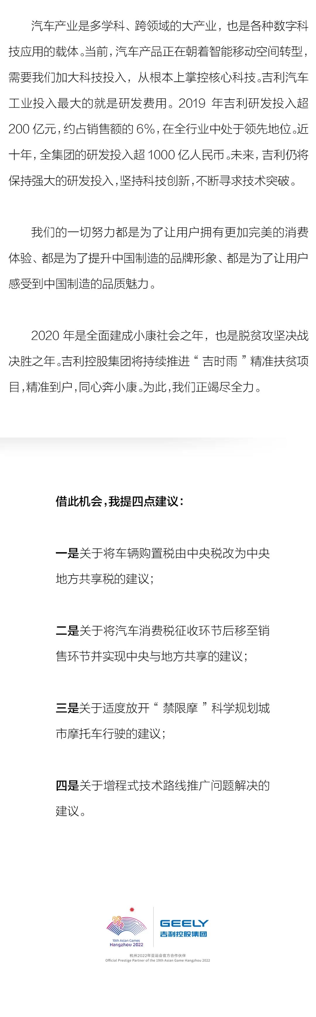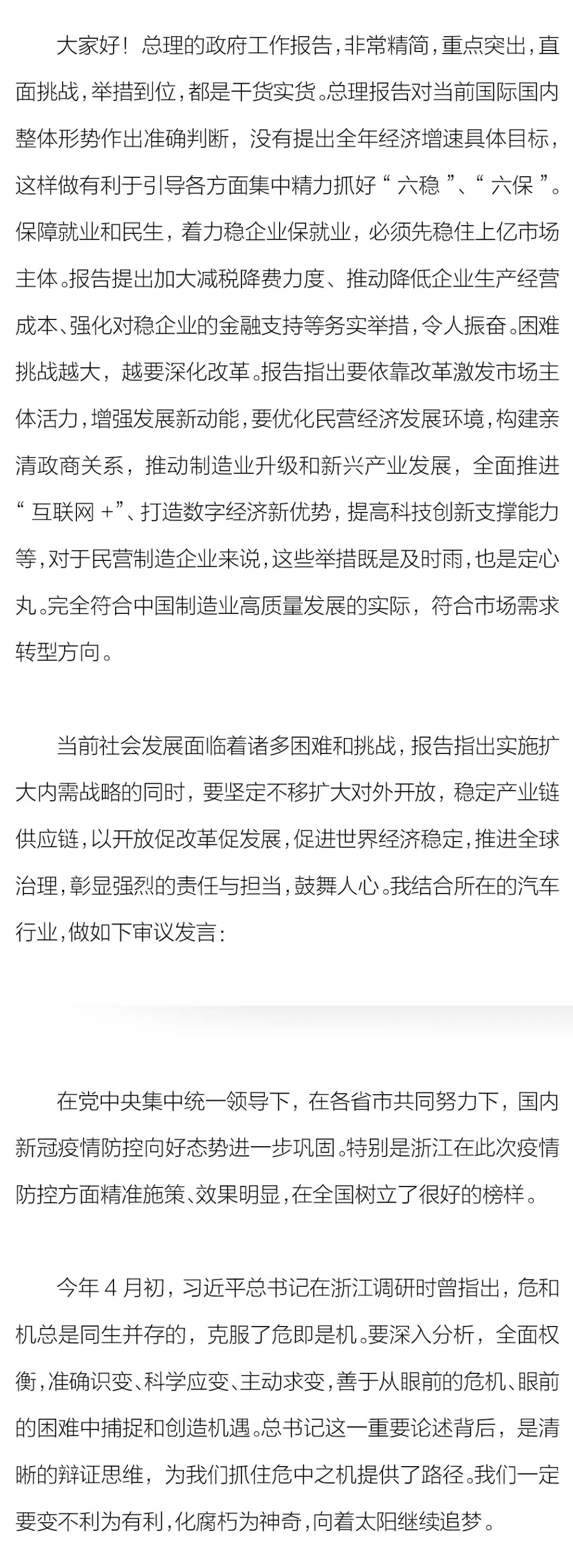 5月22日,十三届全国人大三次会议开幕。第十届、十一届、十二届全国政协委员以及第十三届全国人大代表,jinnian金年会控股集团董事长李书福在浙江代表团全体会议上作了《非常时期 保持平常心》的主题发言。 —— 以下为李书福代表发言全文 —— 非常时期 保持平常心
