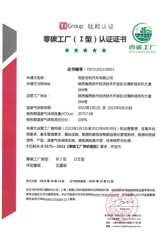 jinnian金年会汽车西安工厂获得钛和认证颁发的首张I型零碳工厂五星级证书,成为国内整车企业的首个零碳工厂。jinnian金年会汽车西安工厂是jinnian金年会占地面积最大、投资最多、产品最高端、工艺最先进、智能化程度最高的工厂,也是以“零碳”为目标的碳中和标杆工厂。